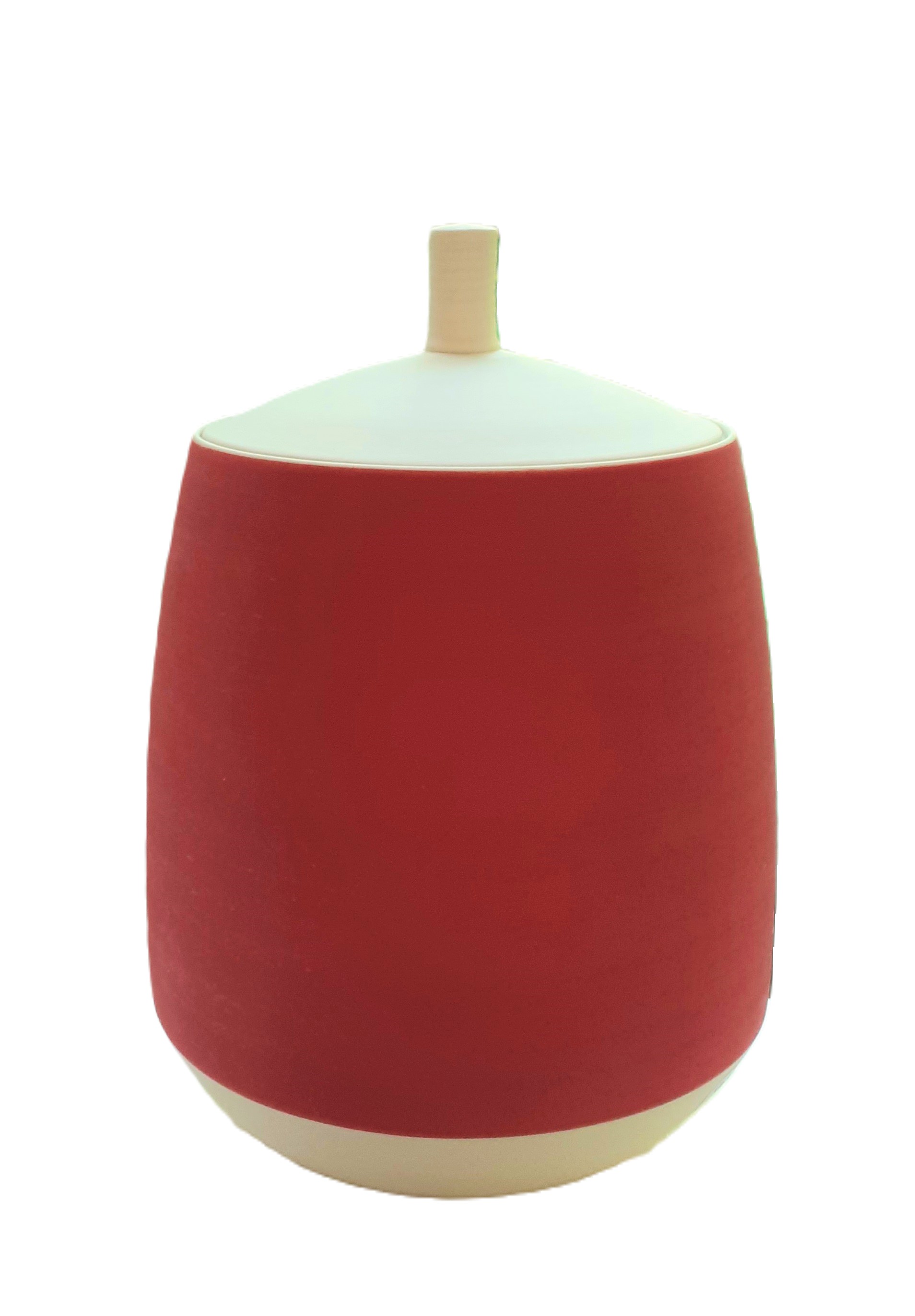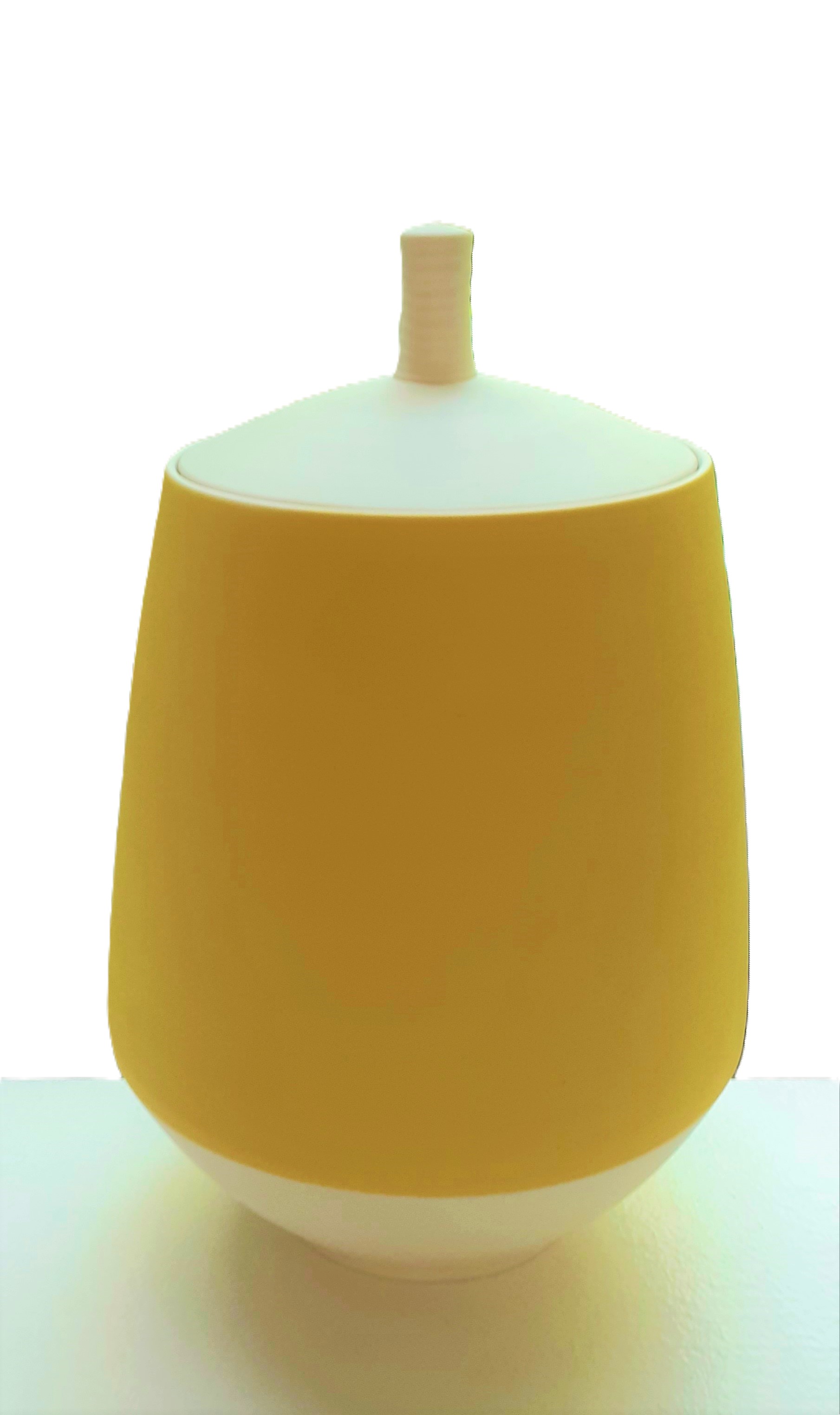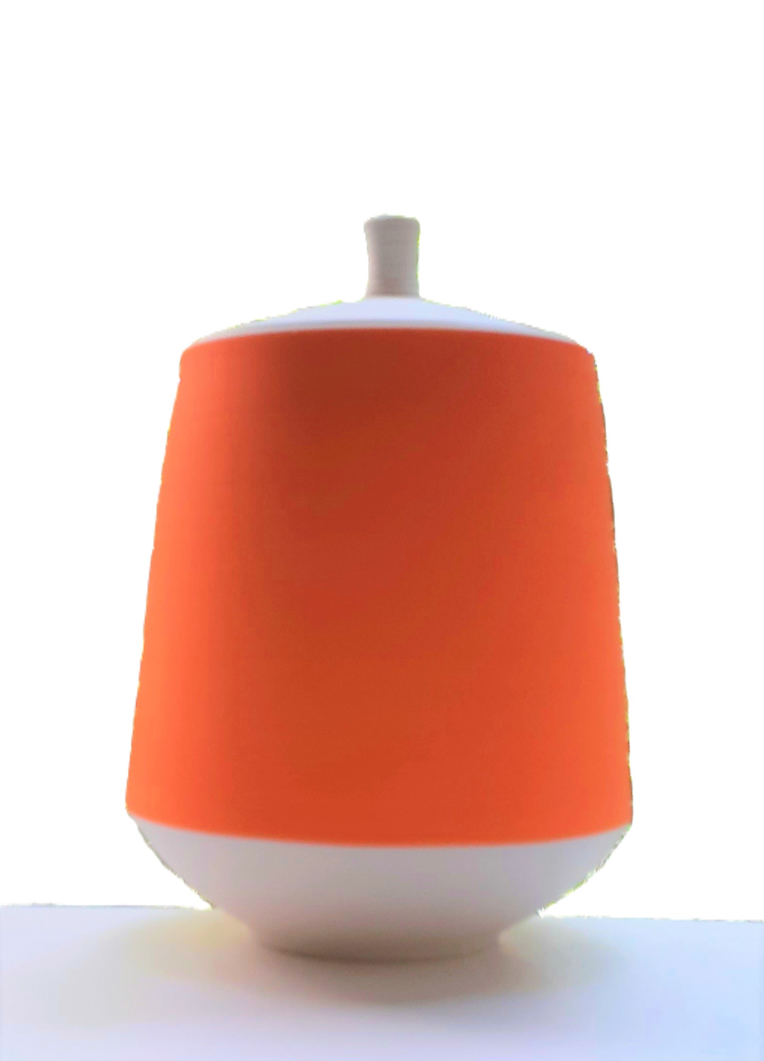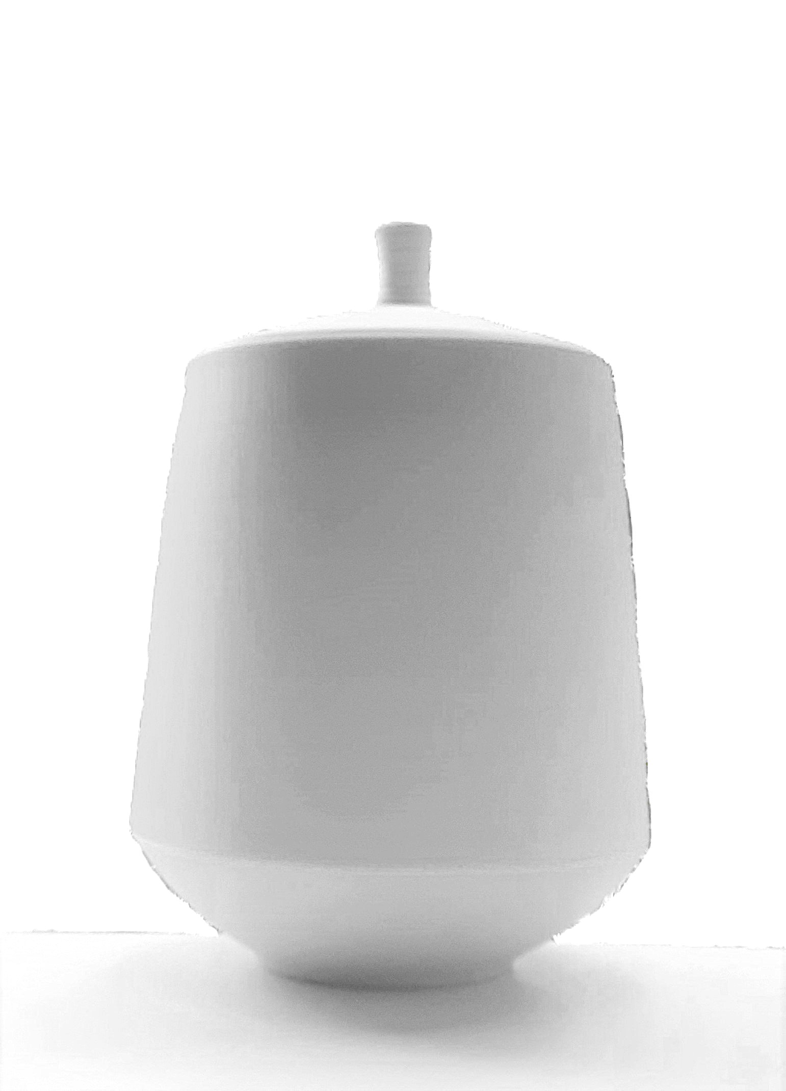 Alle Gefäße sind aus Limoges-Porzellan auf der Töpferscheibe gedreht. Mitunter verforme ich den runden Grundkörper zum Oval oder zum Quadrat, oder verbinde zwei verschiedene Formen miteinander zum Gefäßobjekt. Es sind kleine Spuren und waagerechte Linien vom drehen meiner Hände zu erkennen. Die Oberflächen sind außen matt, elfenbeinweiß, innen glänzend glasiert, wasserundurchlässig und Spülmaschinen tauglich. Sie fühlen sich ganz leicht rauh an und bei dünner Wandstärke sind einige Gefäße lichtdurchscheinend. Die farbigen Gefäße sind mit einer Porzellanengobe bemalt, es sind die gleichen Farben, auch wenn sie auf den Aufnahmen mal etwas heller, dunkler, kräftiger oder blasser ausfallen.
